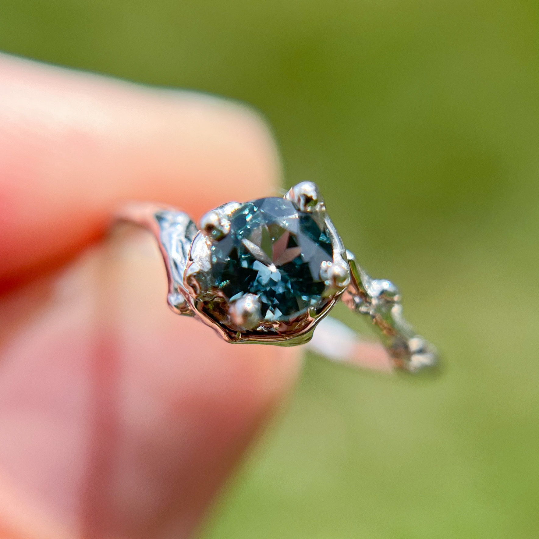 Our Naples teal sapphire Solitaire engagement ring features a dark teal Montana sapphire cradled delicately within a hand-carved twig setting made of solid gold or platinum.
