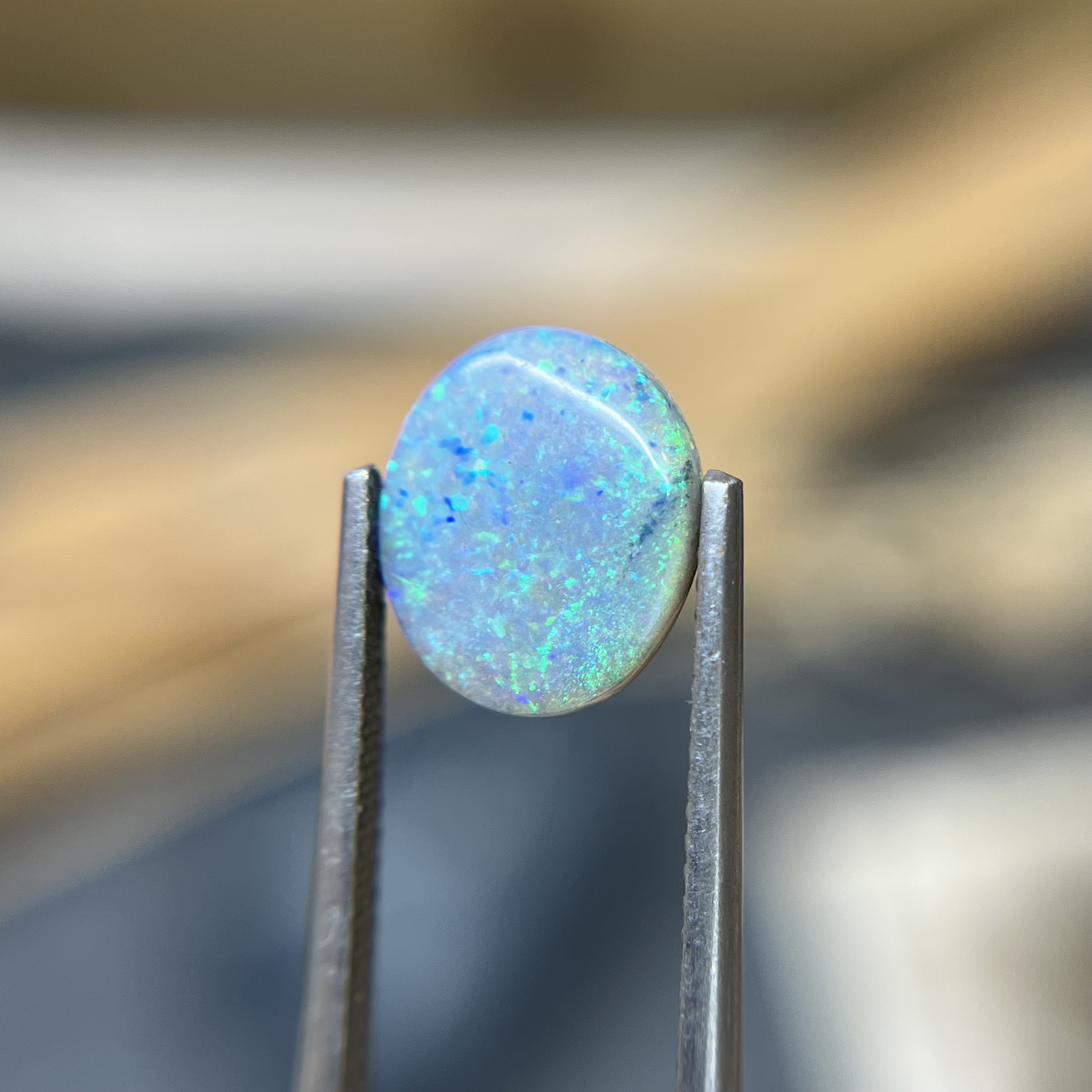 This Australian oval black opal is a striking gem, alive with flashes of vivid color that dance across its dark, velvety base like fireflies in a twilight forest. Mined from the legendary opal fields of Lightning Ridge, its rich play-of-color and natural depth make it one of the rarest and most treasured opals in the world. With its mysterious beauty and luminous character, this stone adds a touch of wild magic and wonder to any ring inspired by the natural world or old-world fantasy.