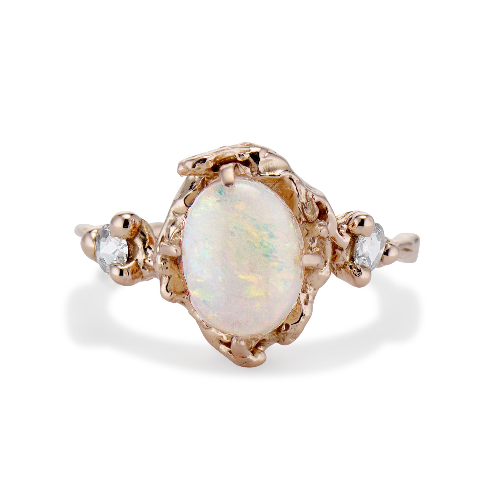 Some people feel that opals symbolize good luck. As far as gems go, they’re unusual in that they are made up of thin sheets of silica or hydrated silicon dioxide (SiO2). They can take on a rainbow-like appearance when seen in different types of light. The name opal comes from Greek word opallios, which means to see a change in color like an eye. Opals are 9 on Mohs scale and have variable hardness.