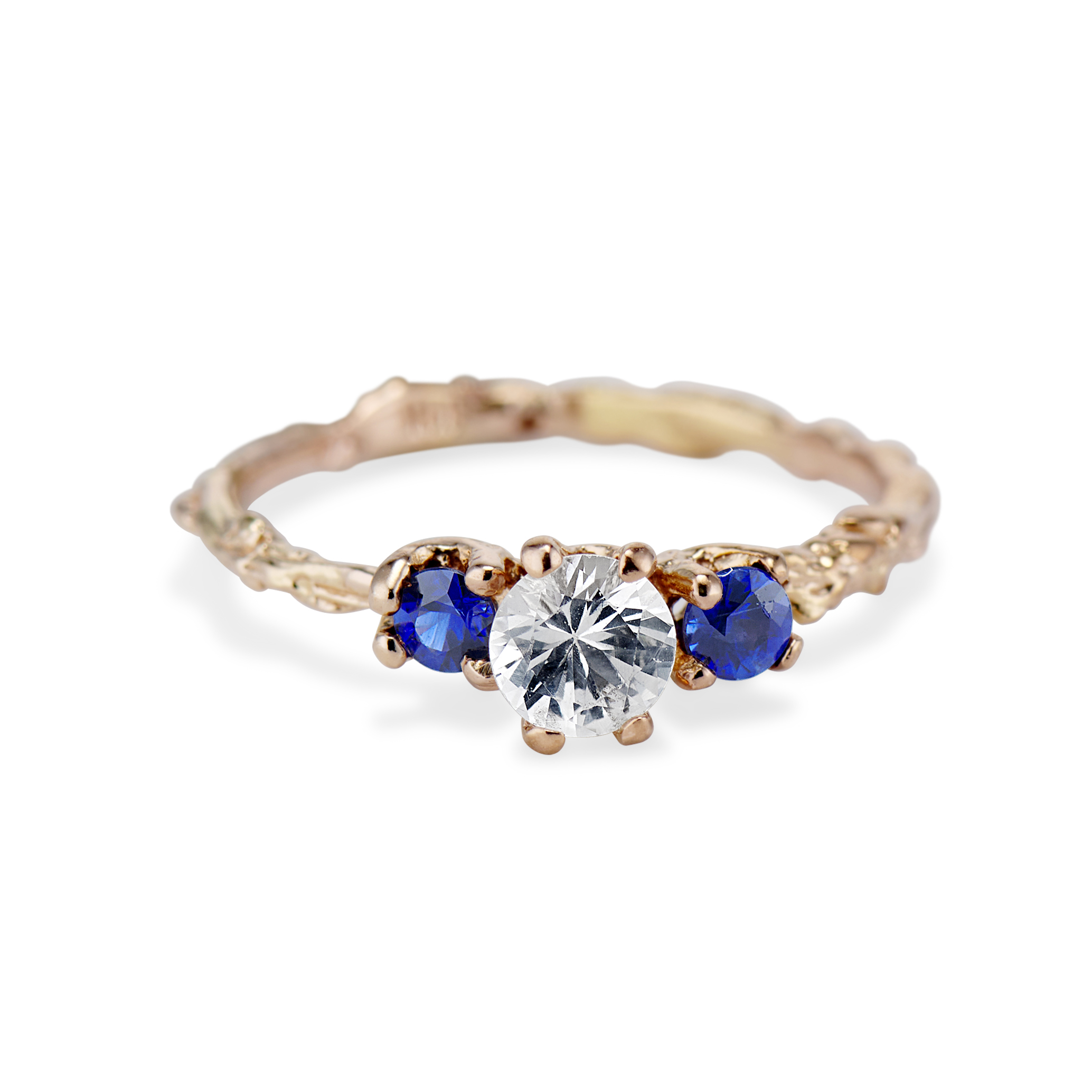 The ring: Naples White Sapphire Three Stone Ring in 14K rose gold