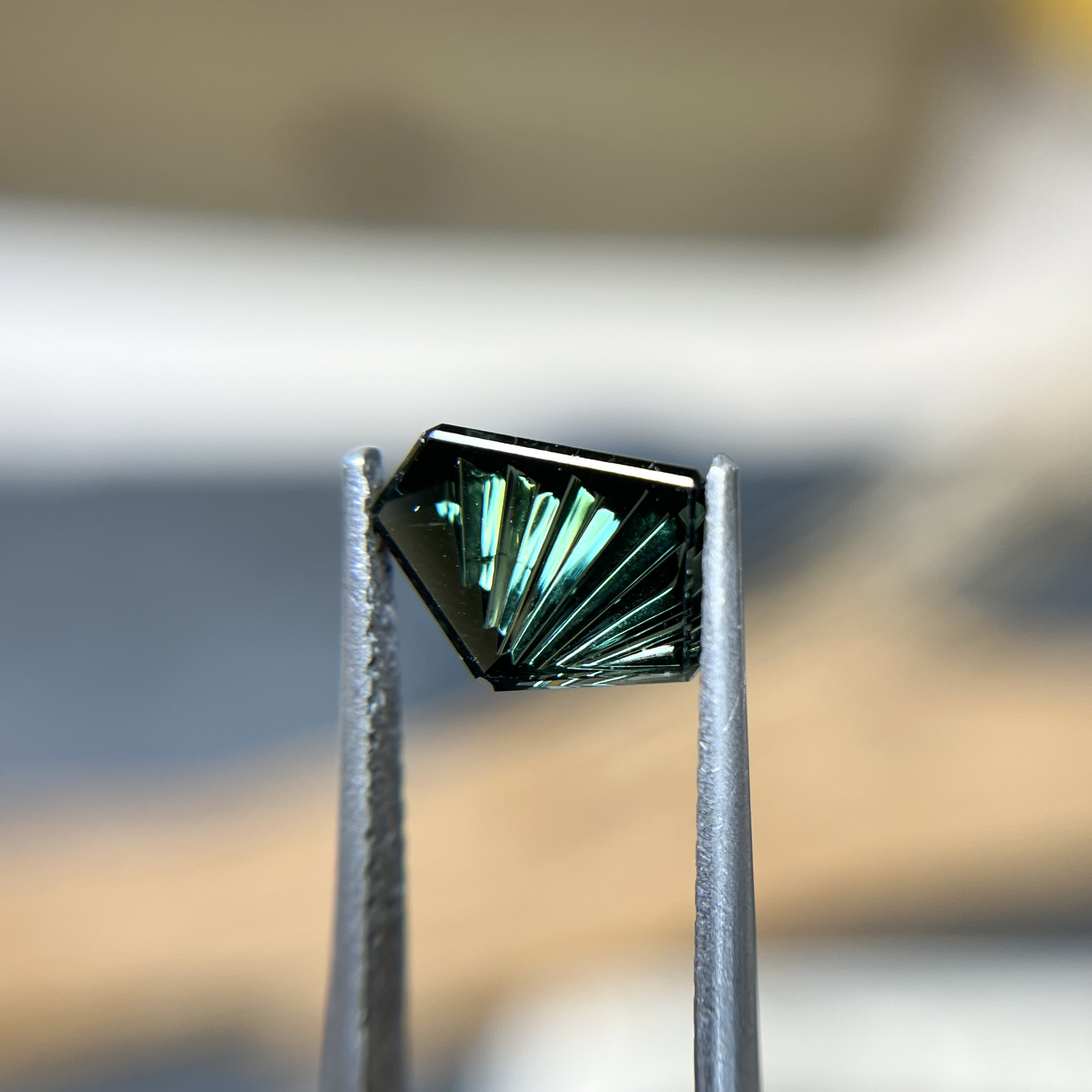 This Blue Green Australian Sapphire glows with rich, shifting tones that echo deep forests and coastal waters. The flowing, sculptural cut enhances the gem’s natural beauty, giving it a mystical quality that’s perfect for a ring inspired by nature’s magic or timeless folklore.
