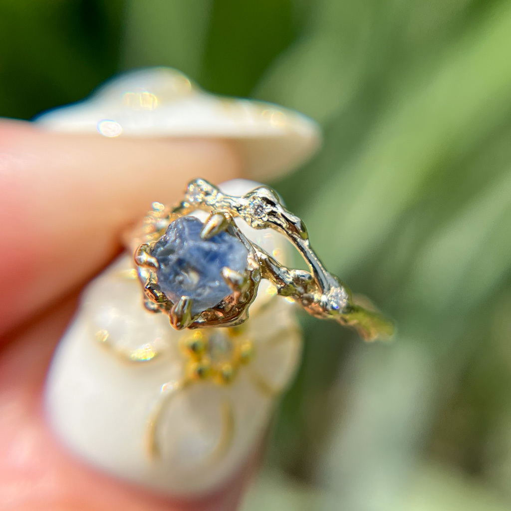 What makes these rings truly unique is that every detail, bud, and texture in the original twig is imprinted in the final ring, capturing the essence of nature's design. The raw sapphires are cast directly into the ring, creating a seamless and harmonious design that enhances the natural beauty of the holly twig.