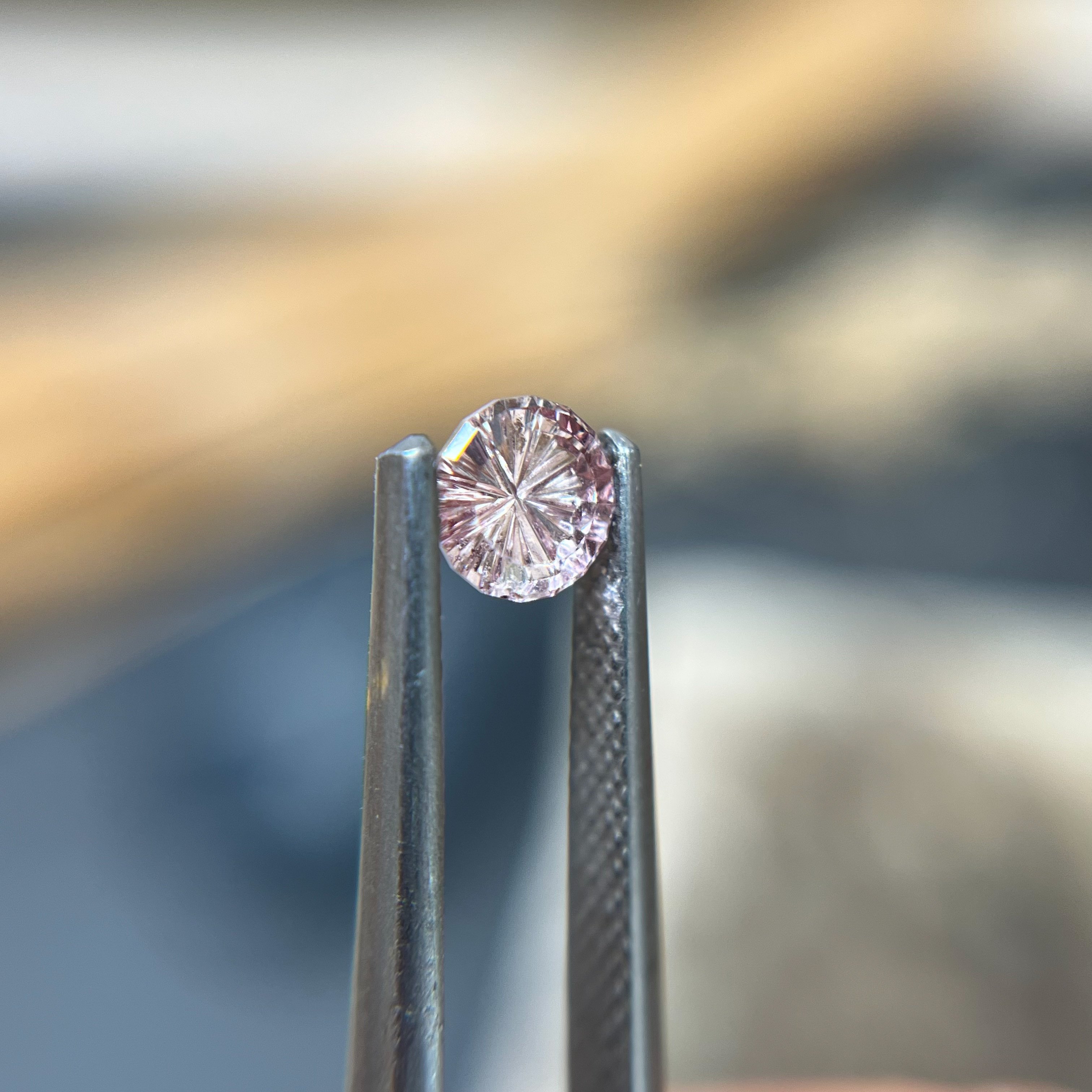 This Dragon Malaya Garnet, cut in John Dyer’s signature Starbrite™ style, radiates with a fiery inner glow that feels plucked from the pages of a myth. Its unique pink-orange hue shimmers with complexity, shifting with the light—and under blacklight, it comes alive with an otherworldly luminescence. Malaya garnets are already rare, but the precision and artistry of Dyer’s cutting elevates this gem into something truly unforgettable—an ideal centerpiece for a ring that draws on the wild beauty of the natural world and the enchantment of imagined realms.