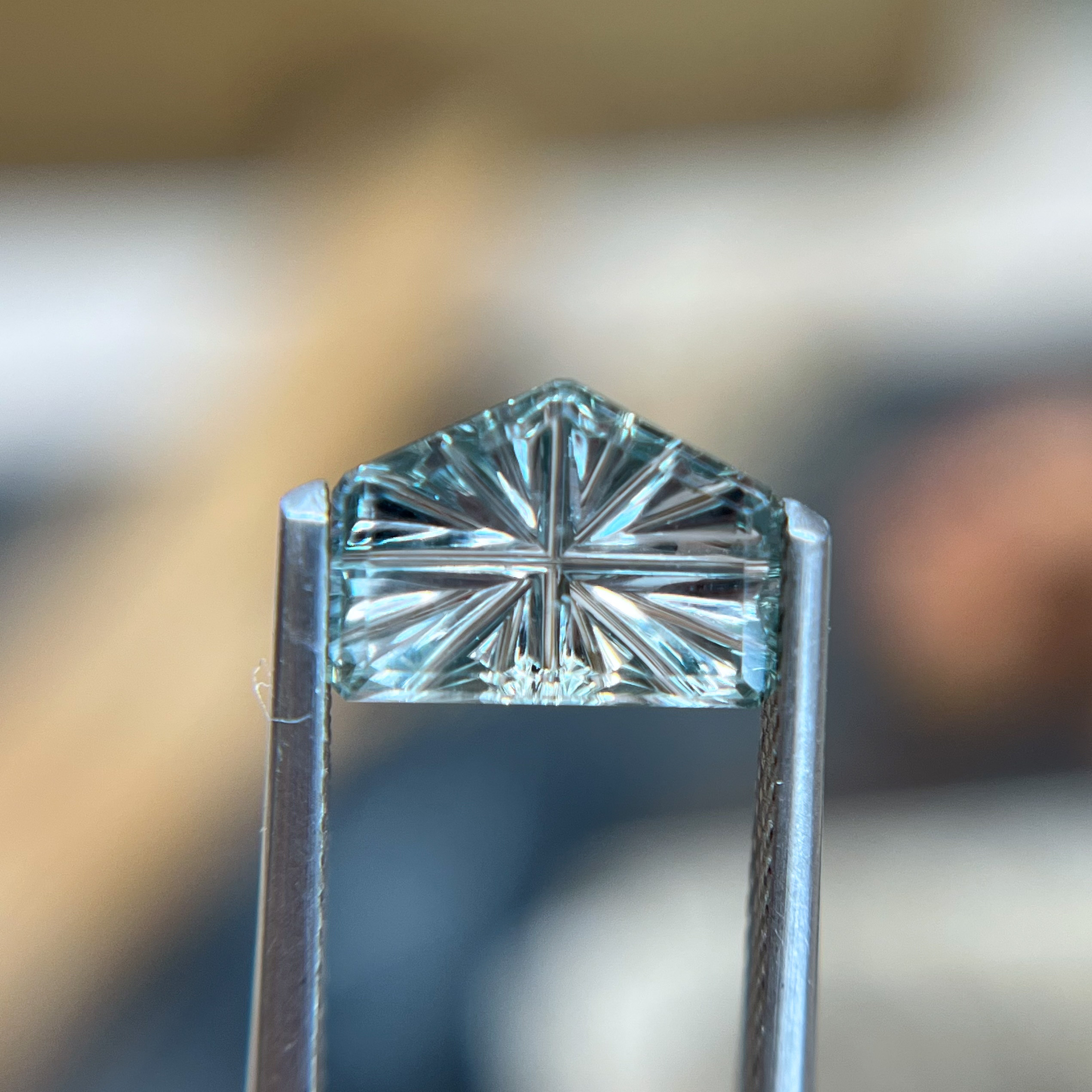 This one-of-a-kind Montana sapphire shimmers with a silvery blue hue, its parti-color depths shifting like moonlight on a quiet forest glade. Cut into the shape of a tiny cottage, the Starbrite cut by John Dyer brings an enchanting, storybook quality to this already extraordinary stone. Known for his masterful faceting, Dyer creates gemstones that capture light in breathtaking ways, and this sapphire is no exception—each facet gleams with an otherworldly brilliance. A rare treasure, it’s the perfect choice for a ring that feels plucked from the pages of a fairytale.