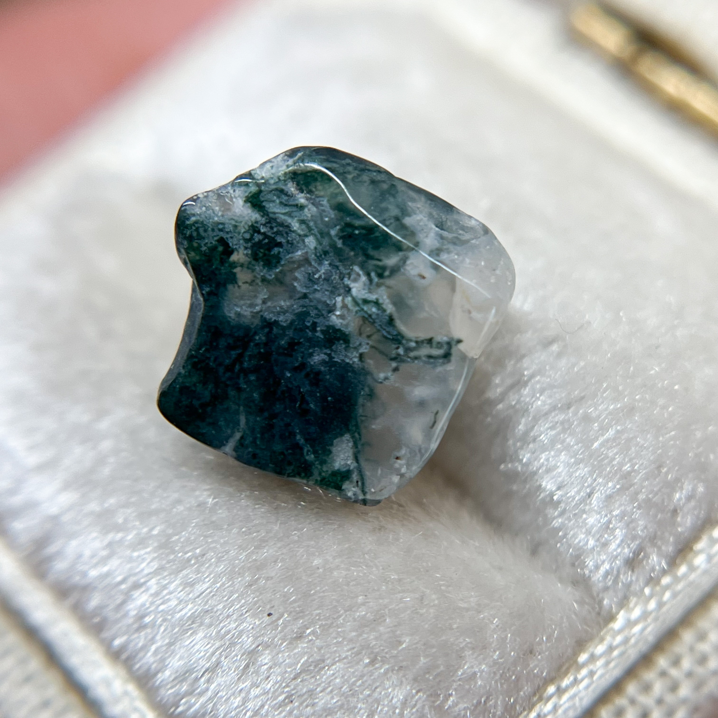 Discover the enchanting allure of the forest green uncut moss agate, a gemstone that evokes the magic of nature's untouched beauty. This unique forest green moss agate gemstone, with its intricate patterns reminiscent of lush woodland landscapes, is an extraordinary choice for a fantasy-inspired engagement ring. Its organic charm and rare beauty make it the perfect symbol of love for those who cherish the wonder of the natural world.