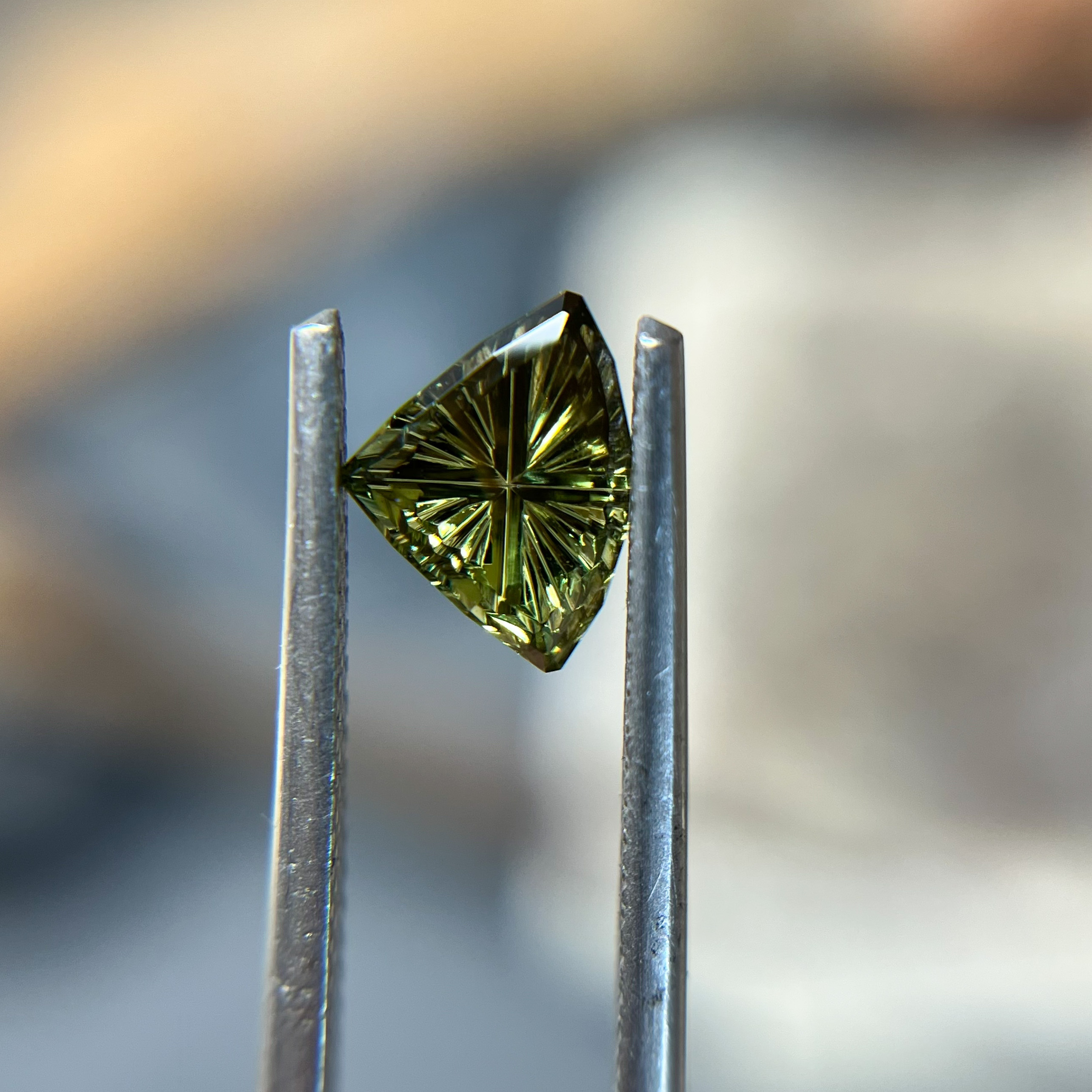 This Green Australian Sapphire, cut in John Dyer’s signature Starbrite™ style, radiates with a brilliance that feels almost otherworldly. The precision of Dyer’s craftsmanship transforms this triangle-cut gem into a kaleidoscope of light and depth—each facet sculpted to draw the eye inward. With its vibrant green hues echoing moss-covered glades and ancient forest paths, this sapphire brings a touch of magic and wild elegance to any ring, whether inspired by folklore, nature, or timeless romance.