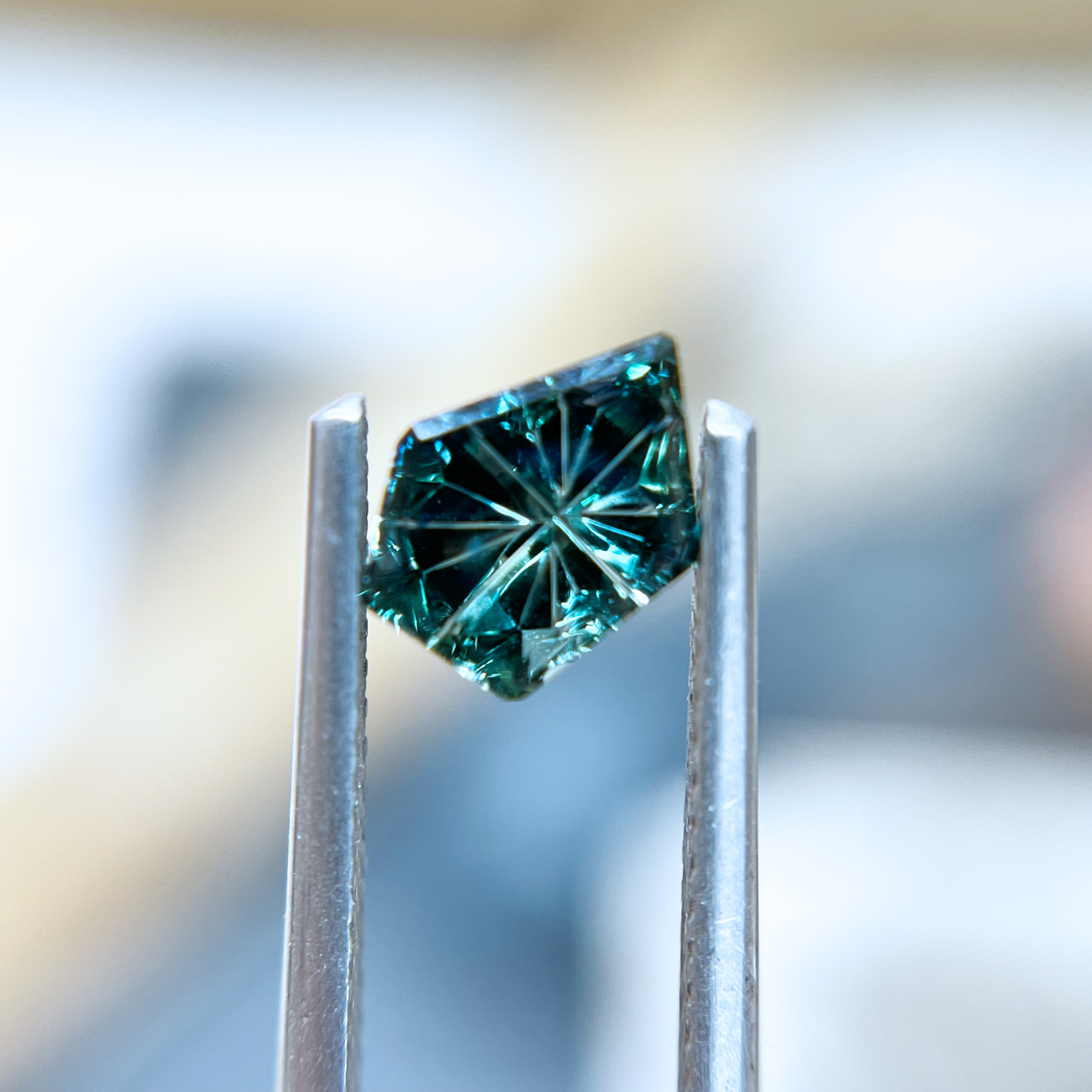 This Green Blue Parti Color Australian Freeform Sapphire, cut with the exclusive StarBrite™ cut by John Dyer, adds a touch of magic to any engagement ring. The one-of-a-kind cut catches the light in unexpected ways, revealing flashes of green and blue that seem to shift with every glance. With John Dyer’s exceptional craftsmanship, this stone stands out as a rare beauty, perfect for those seeking a distinctive, artisanal piece that feels both timeless and adventurous. Its unique character makes it the ideal centerpiece for a ring inspired by nature’s wonders or an enchanting storybook world.