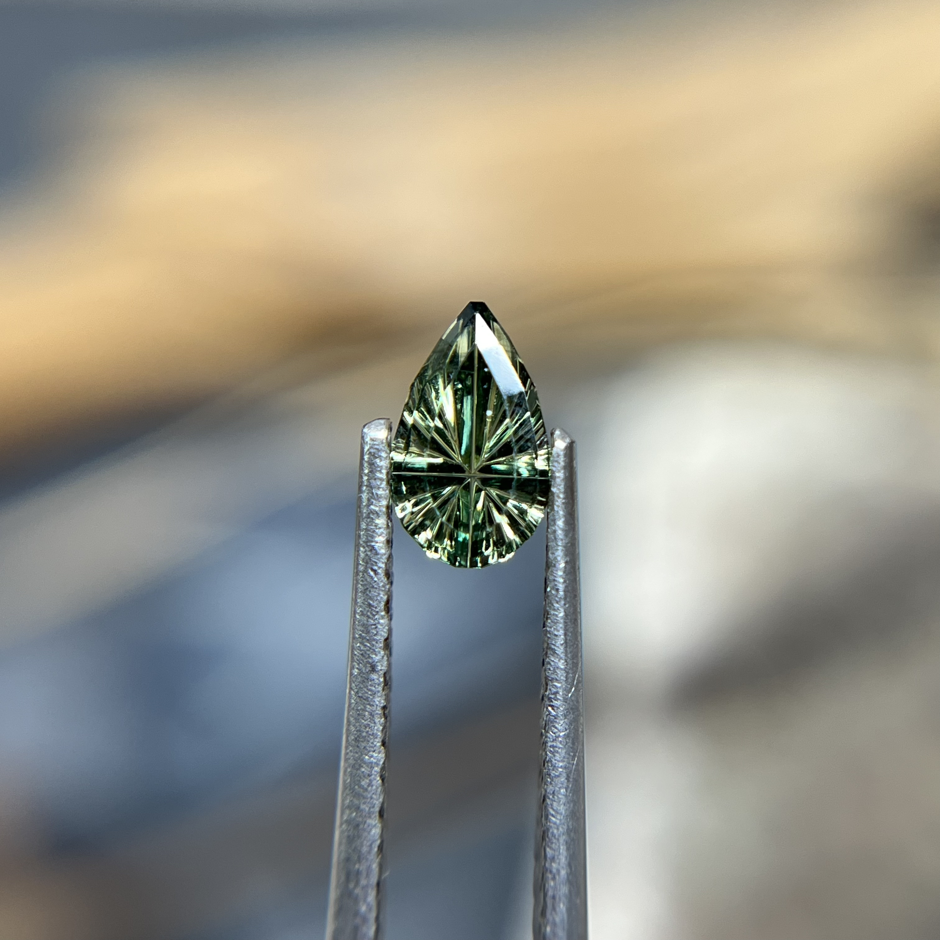 This pear shaped Australian Sapphire shimmers with deep forest tones and flashes of mossy gold. Its enchanting color palette and precision-cut brilliance make it a captivating centerpiece — ideal for designs inspired by wild landscapes and timeless tales.