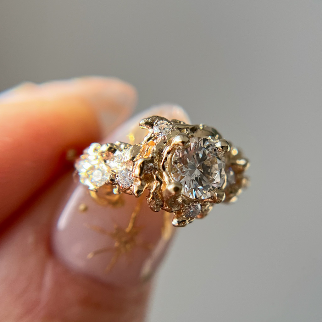 At the heart of this mesmerizing ring lies a captivating 6mm brilliant-cut diamond, radiating brilliance and elegance. Surrounding it, like a scattering of stardust, are a multitude of smaller diamonds, meticulously set to create a breathtaking cluster. These diamonds shimmer and sparkle, akin to tiny stars illuminating the night sky.