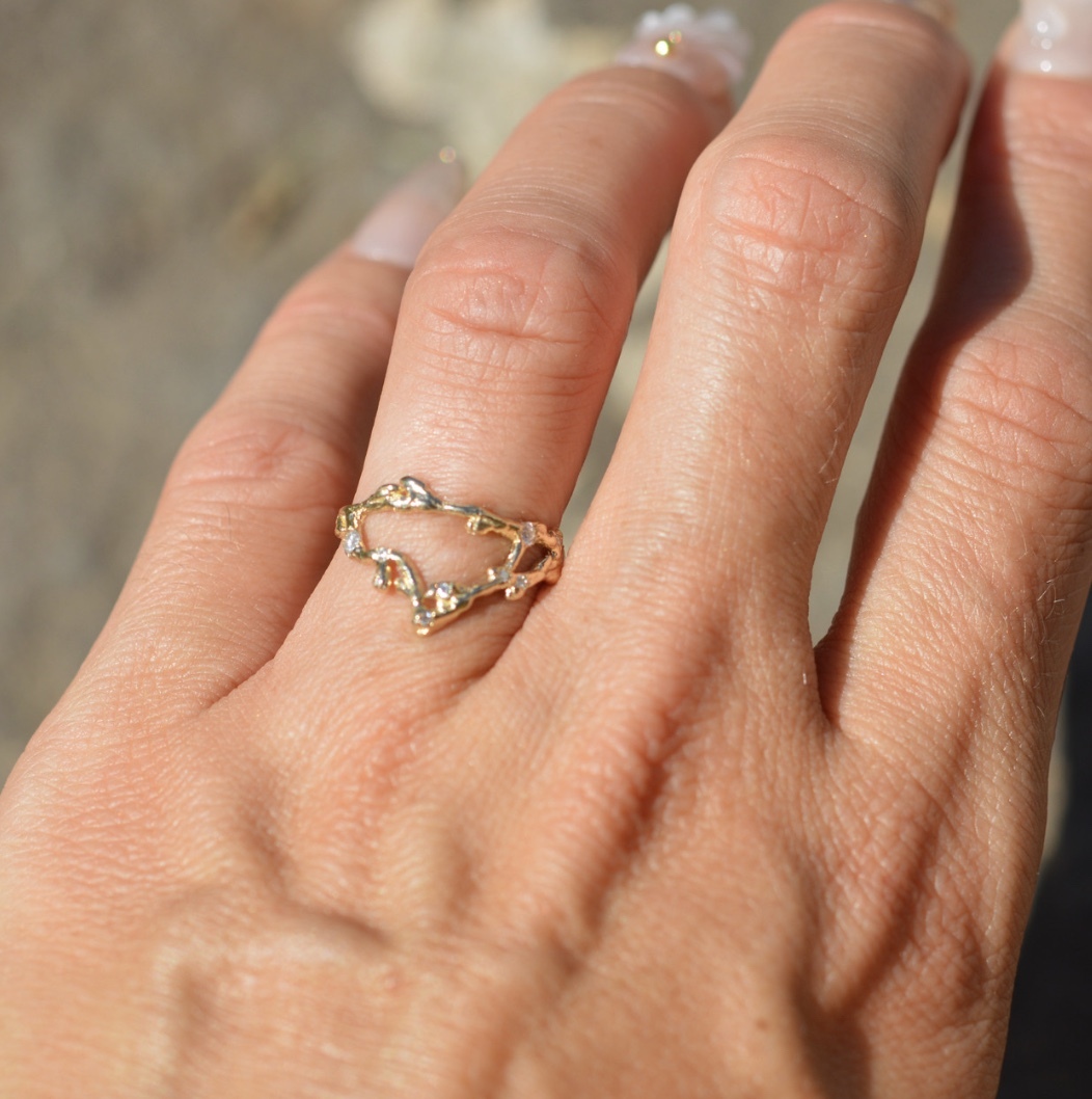 Our second featured piece, the dreamy Sapling Cuff Bracelet, is cast directly from the texture of a real sapling twig in a 14k gold band. Its organic silhouette gently curves around the wrist like a living branch, carrying the same earthy elegance that defined Feyre’s earliest days in the Spring Court. This cuff emulates the floral, nature-rich elements like stepping into the woods on a bright Spring morning, where buds are beginning to bloom–similiar to Feyre’s blossoming relationship between her and Rhysand. In rose gold, this piece takes on a romantic softness, emphasizing the rose-colored innocence of Feyre before her world changed forever.