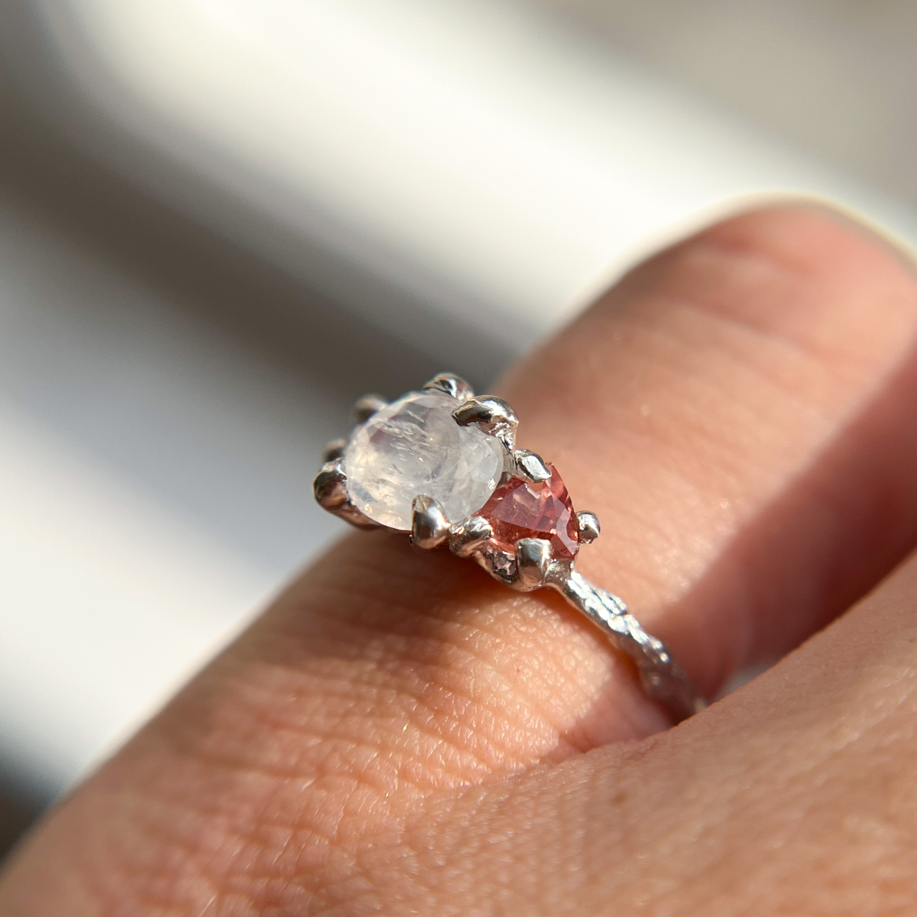 This three-stone ring centers a white rainbow moonstone, flanked on either side by two warm Oregon sunstones, ethically sourced and mined right here in the USA. The band is hand-cast from a real budded twig, giving its signature organic ridges and indents where nature-inspired fine jewelry becomes the epitome of the forest pressed into gold.