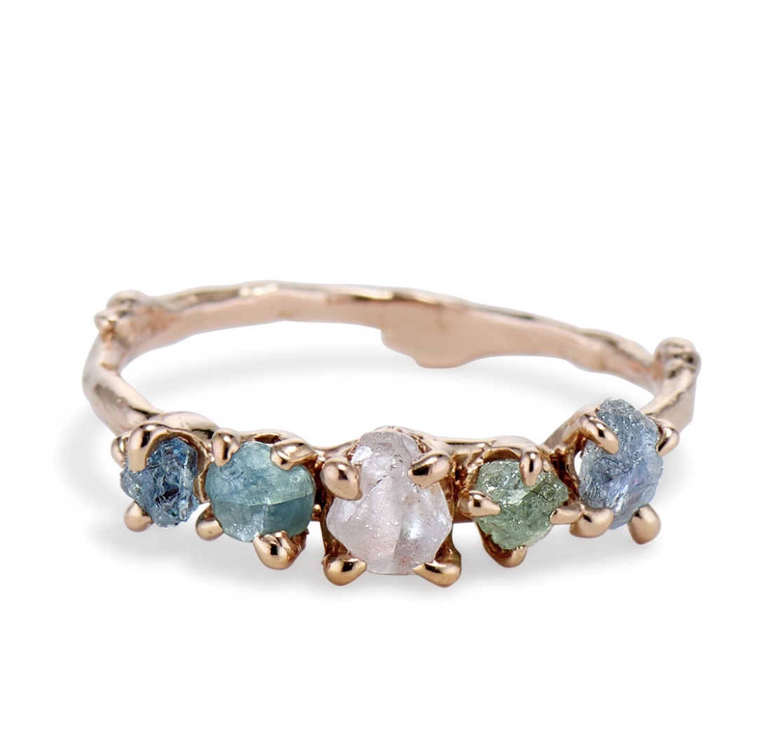This stylish ring isn’t one that follows the traditional rules. Multi-stone rings can come with two multi-colored stones that meet at an embrace like Megan Fox’s Toi et Moi ring. Or, perhaps, even a raw four-stone ring with some unique prong settings at the horizon-radiating a cascade of earthwashed, sunset hues, like our Garland Pink Montana Sapphire Four Stone Ring.