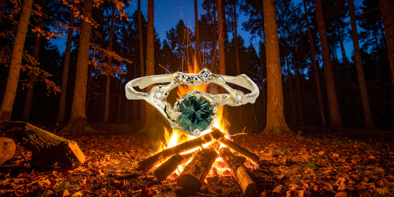 The Moment: Once you are warm and settled within your blankets, share some stories, bask in the glow of the fire and your joy, and speak from the depth of your heart about the warmth they bring to your life. Now is the perfect moment to invite your love to be your partner forever, with a vibrant, green Sapphire half halo ring, glimmering in the warmth of the fire in front of you.