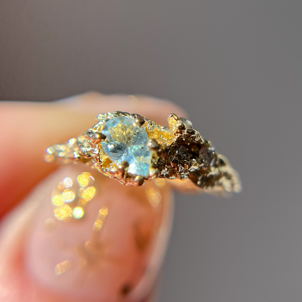 Nestled within this wondrous ring is a shimmering pale blue aquamarine, its pear shape cut reminiscent of a sacred droplet bestowed upon us by the celestial seas. As the gentle light dances upon its surface, it unveils a captivating brilliance that evokes the tranquil depths of a hidden lagoon.