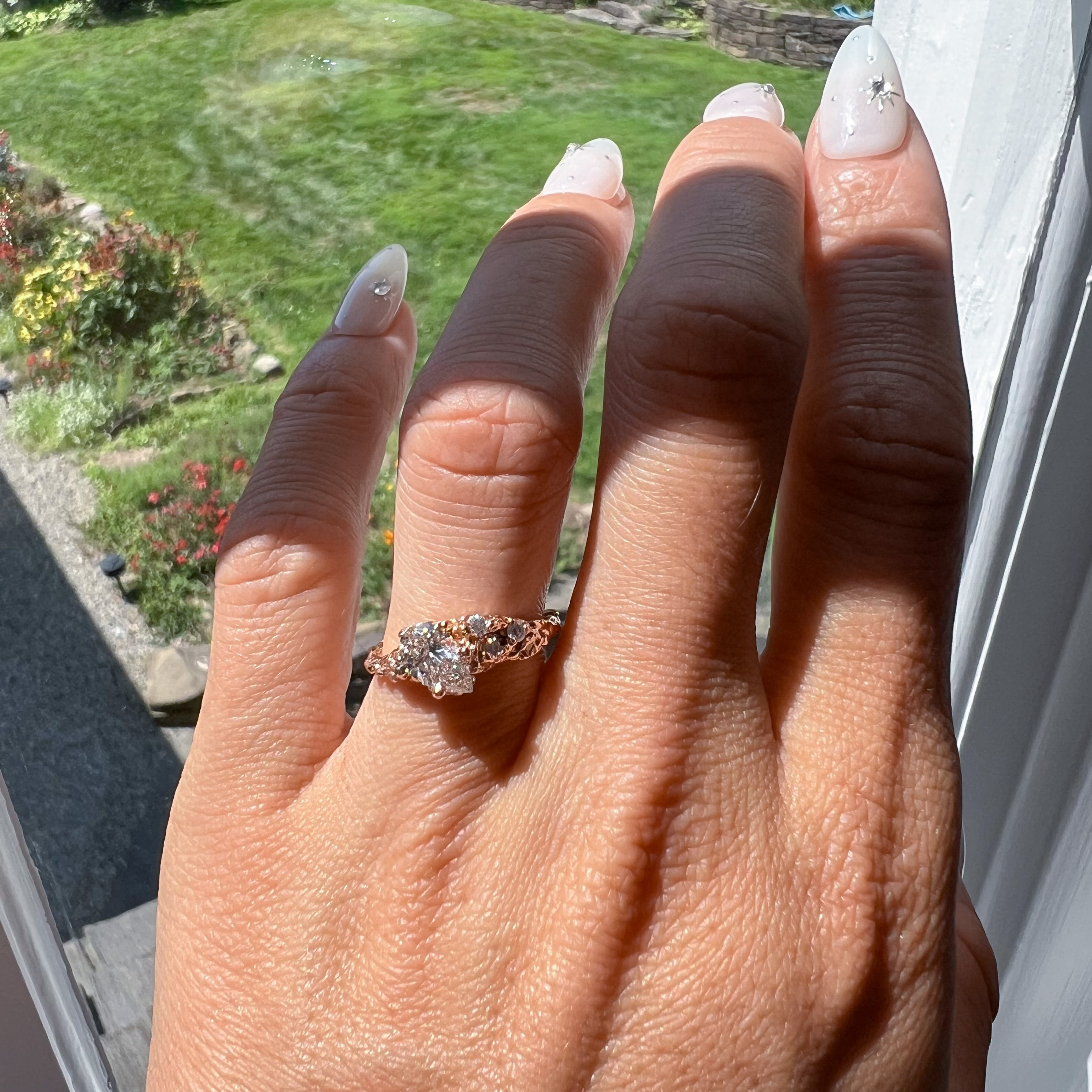 At its heart lies a mesmerizing pear-cut diamond, radiating an otherworldly brilliance that captures the imagination. Nestled within an asymmetric design, the ring is a testament to the whimsical unpredictability of nature's artistry. A subtle symphony of tiny diamonds adorns the band, like dewdrops scattered upon leaves kissed by the morning sun.