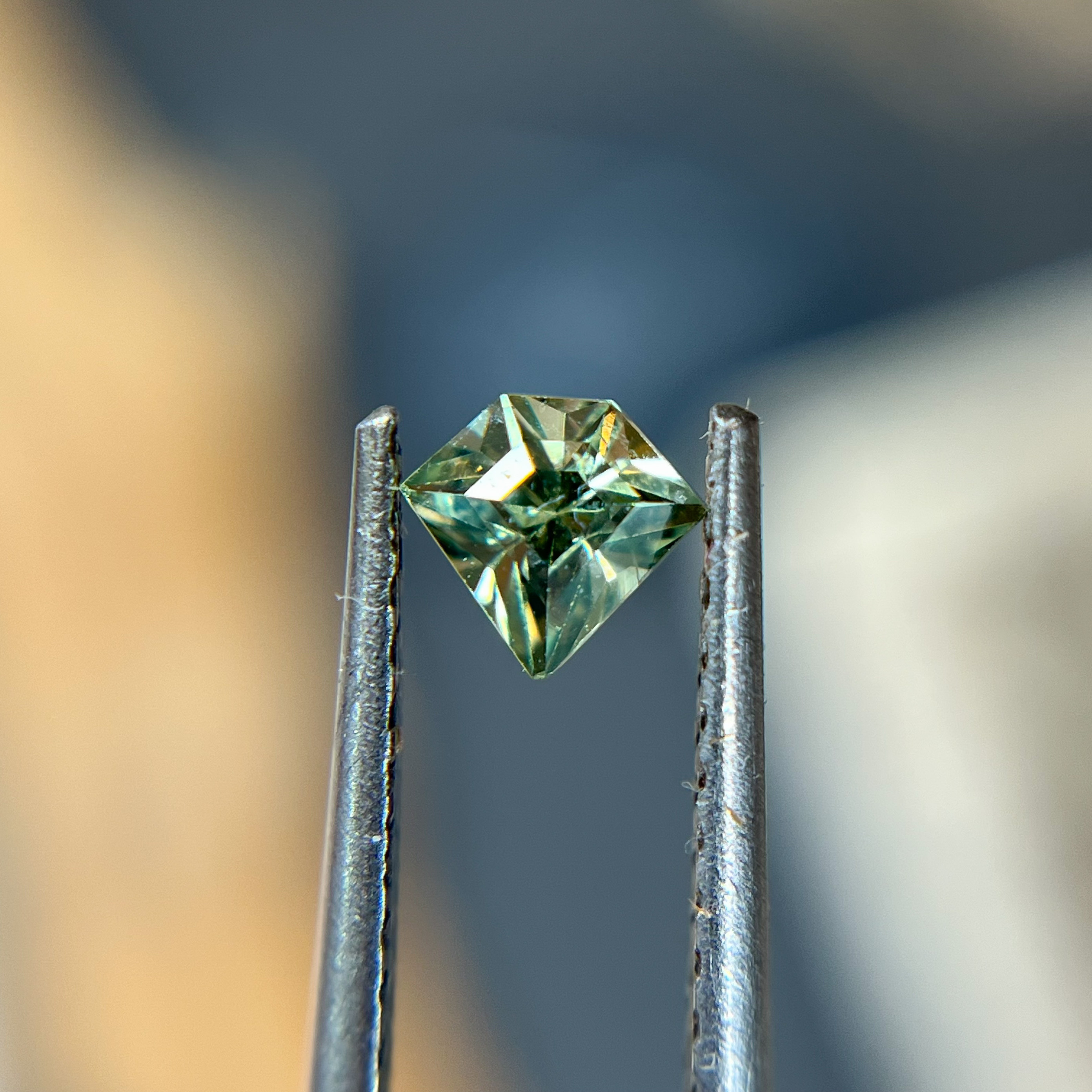 This kite-shaped Australian sea green sapphire sparkles with the captivating hues of ocean depths, evoking a sense of wonder and tranquility. Its unique cut enhances the stone's natural brilliance, reflecting light in a dance reminiscent of sunlight filtering through a forest canopy. A true gem of nature, this sapphire is a rare find, perfect for those seeking an enchanting centerpiece that tells a story of elegance and magic, harmonizing beautifully with the ethereal qualities of any ring design.