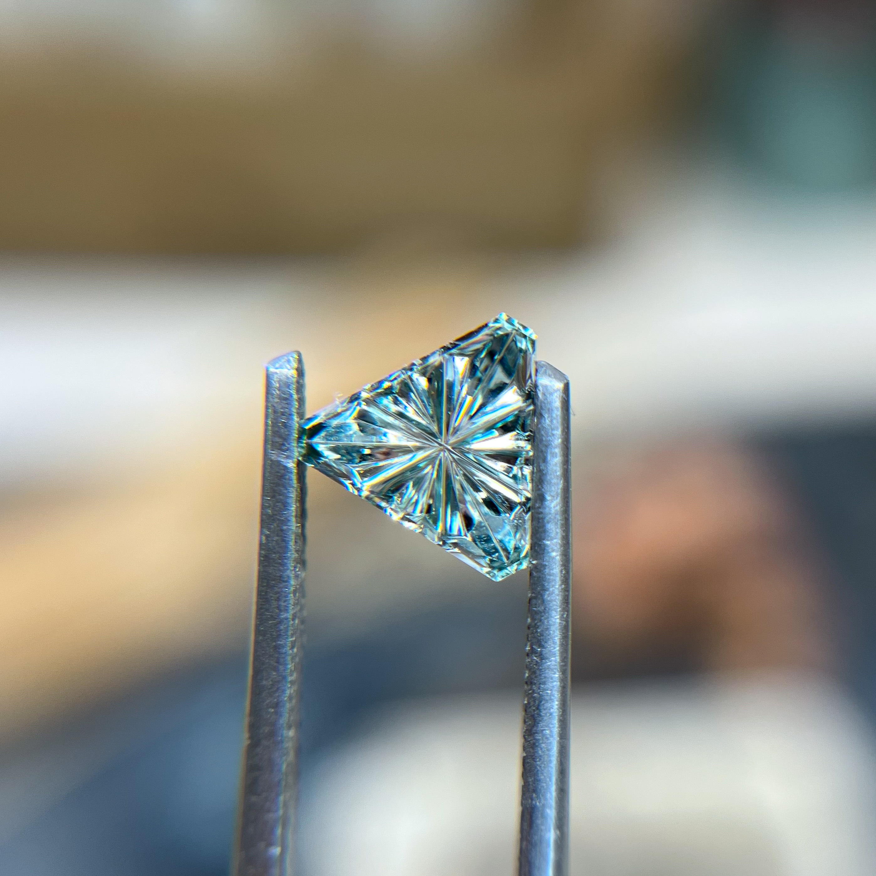 This light blue Montana sapphire, expertly shaped into a striking triangle by award-winning gem cutter John Dyer, showcases his signature StarBrite™ cut—a mesmerizing play of light that sets it apart from traditional faceting. Its brilliance and precision make it a rare treasure, perfect for a ring that feels both ethereal and untamed, as if plucked from a forgotten legend. With its unique cut and masterful craftsmanship, this sapphire is a testament to artistry and individuality.