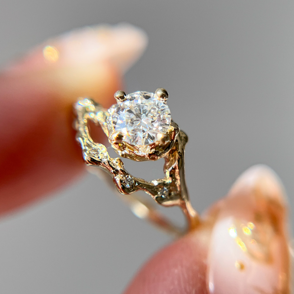 This Naples Half Halo Ring features a stunning Forever One Moissanite at its center, while the rest of the ring is hand-sculpted from a real twig. On one side of the center stone are four tiny diamonds in a half halo that mirrors the matching contour band ring.