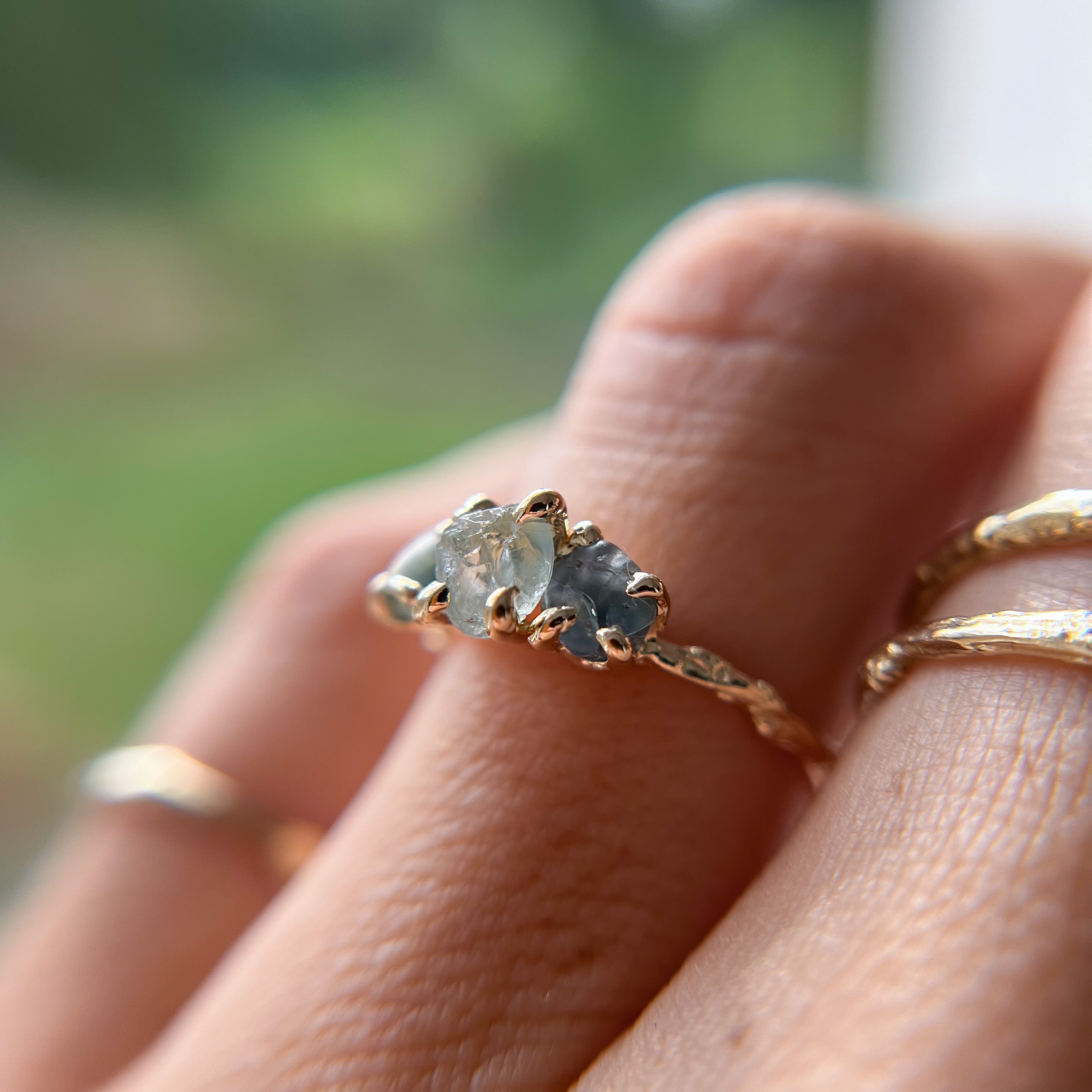 Naples three stone sapphire engagement ring features three rough (uncut) natural Montana sapphires in shades of blue and teal.