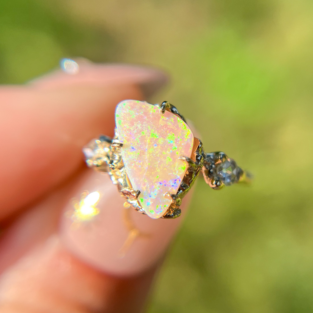 What makes these rings truly unique is that every detail, bud, and texture in the original twig is imprinted in the final ring, capturing the essence of nature's design. The raw sapphires are cast directly into the ring, creating a seamless and harmonious design that enhances the natural beauty of the holly twig.