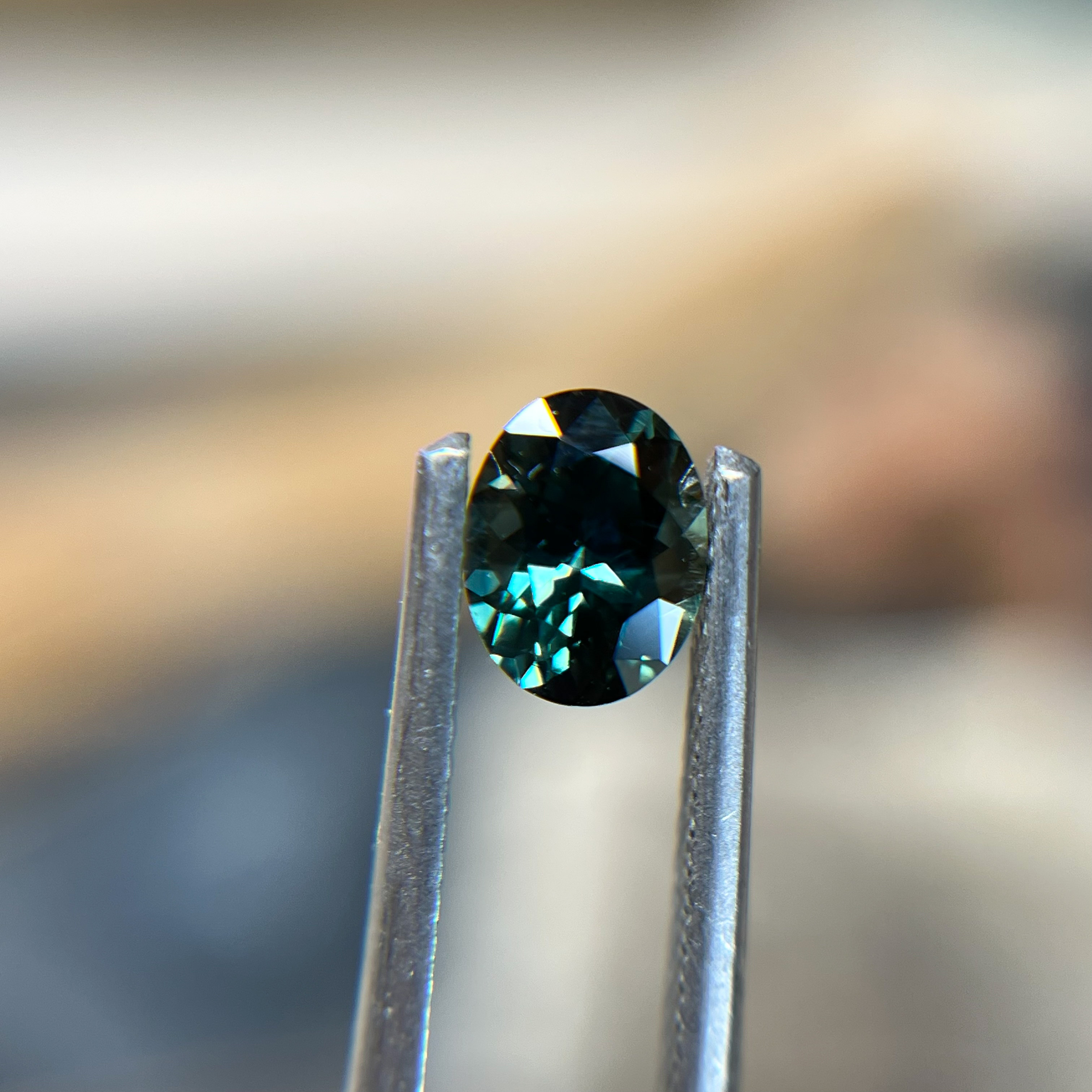 A mesmerizing deep teal blue sapphire from Australia, expertly cut by Tatum Gems to reveal its unique depth and brilliance. This rare parti-colored gem shimmers with shifting hues, a testament to the earth’s artistry, making it a perfect choice for a ring that feels both otherworldly and deeply rooted in nature. Australian sapphires are treasured for their rich, untamed beauty, and Tatum’s precision cutting enhances their one-of-a-kind character, ensuring no two are ever alike.