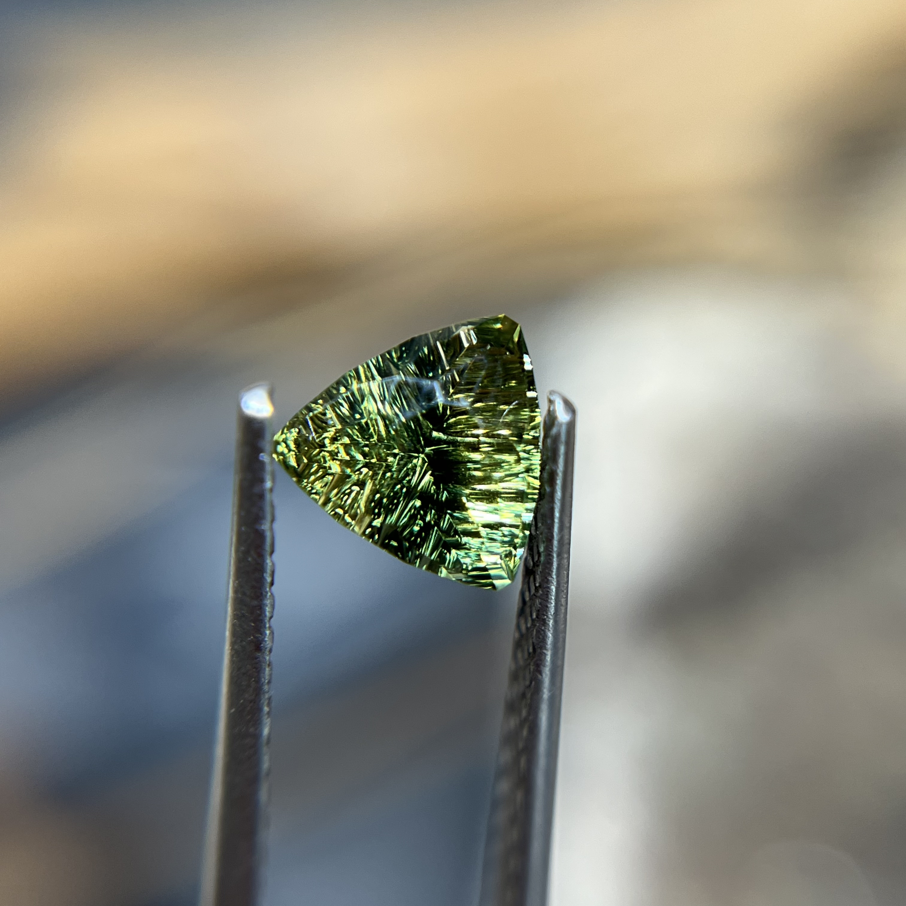 This Parti Color Australian Sapphire features a captivating swirl of forest greens, golden tones, and inky blues that shift with every glance. Its dimensional cut and rich natural palette evoke the mystery of wild landscapes and ancient magic, making it a stunning focal point for rings inspired by nature.