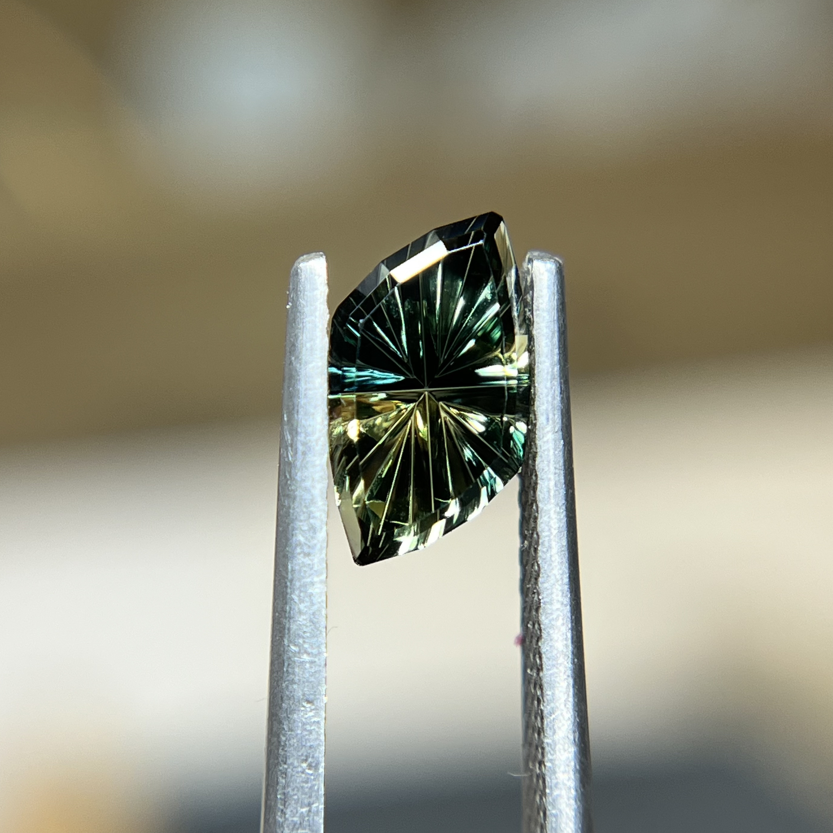 This radiant yellow, teal, and blue parti color sapphire, cut in the signature freeform Starbrite™ style by John Dyer, dances with a blend of vibrant hues, creating a mesmerizing display of light and color. Its unique trapezoidal shape and artisan cut make it an enchanting choice for those who seek something truly one-of-a-kind, perfect for a ring that feels both timeless and magical. The Starbrite™ cut captures the stone’s natural beauty, allowing the colors to shimmer in unexpected ways, adding an element of wonder to any custom design.