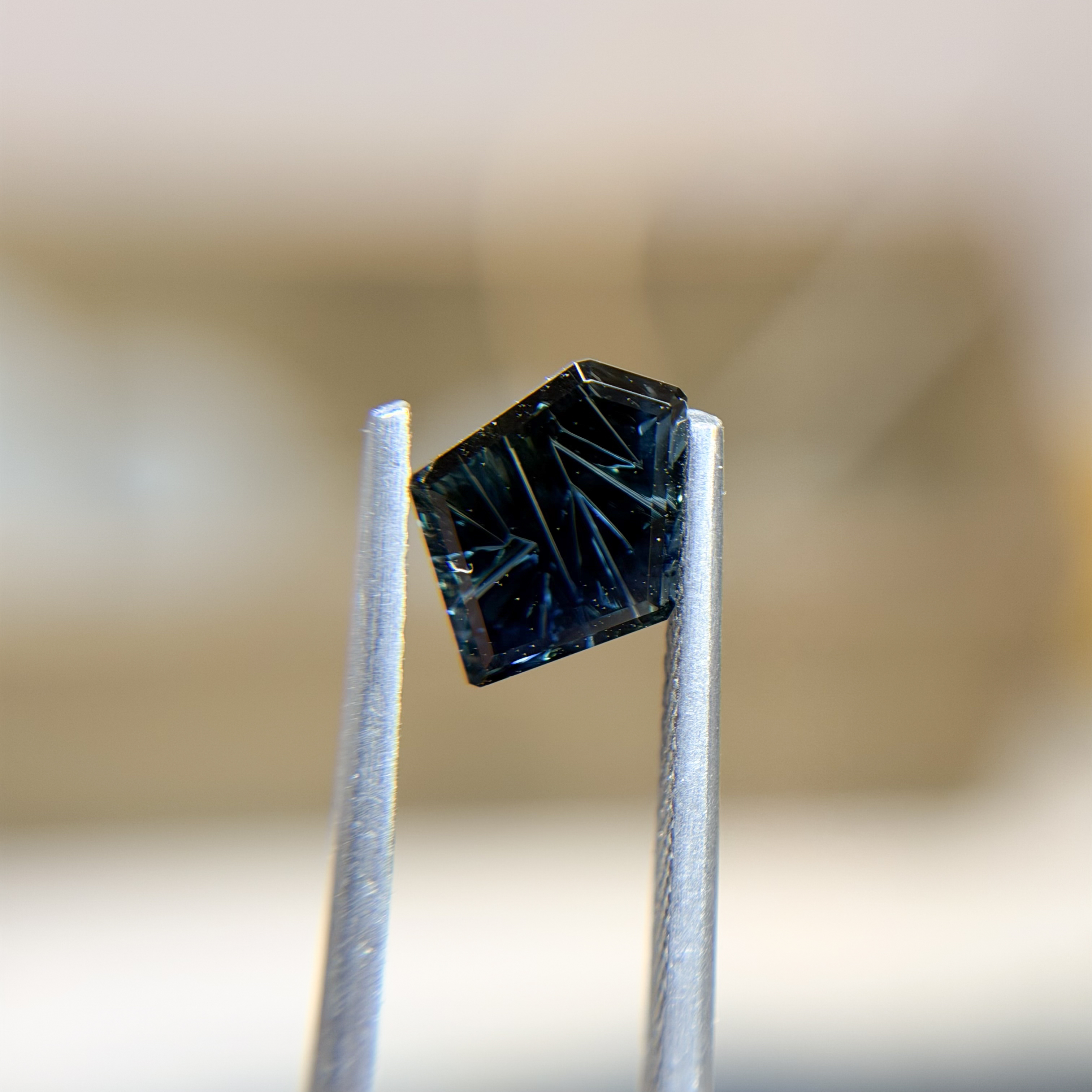 Cool streams of teal and midnight blue flow together inside this Australian sapphire, echoing the meeting point of river and twilight sky. The freeform Dreamscape™ cut accentuates the stone’s movement, allowing color to slip and deepen as the stone turns. Equal parts serene and dramatic, it’s a captivating choice for a design that leans into fluidity, contrast, and the quiet mystery of layered color.