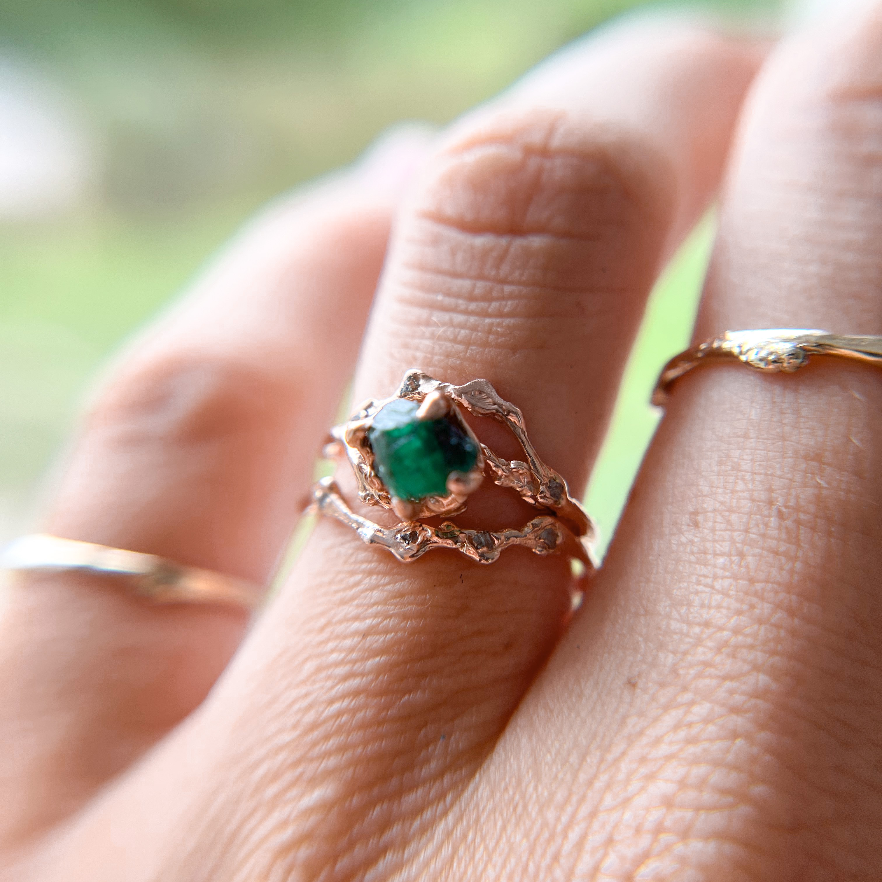 What makes these rings truly unique is that every detail, bud, and texture in the original twig is imprinted in the final ring, capturing the essence of nature's design. The raw sapphires are cast directly into the ring, creating a seamless and harmonious design that enhances the natural beauty of the holly twig.