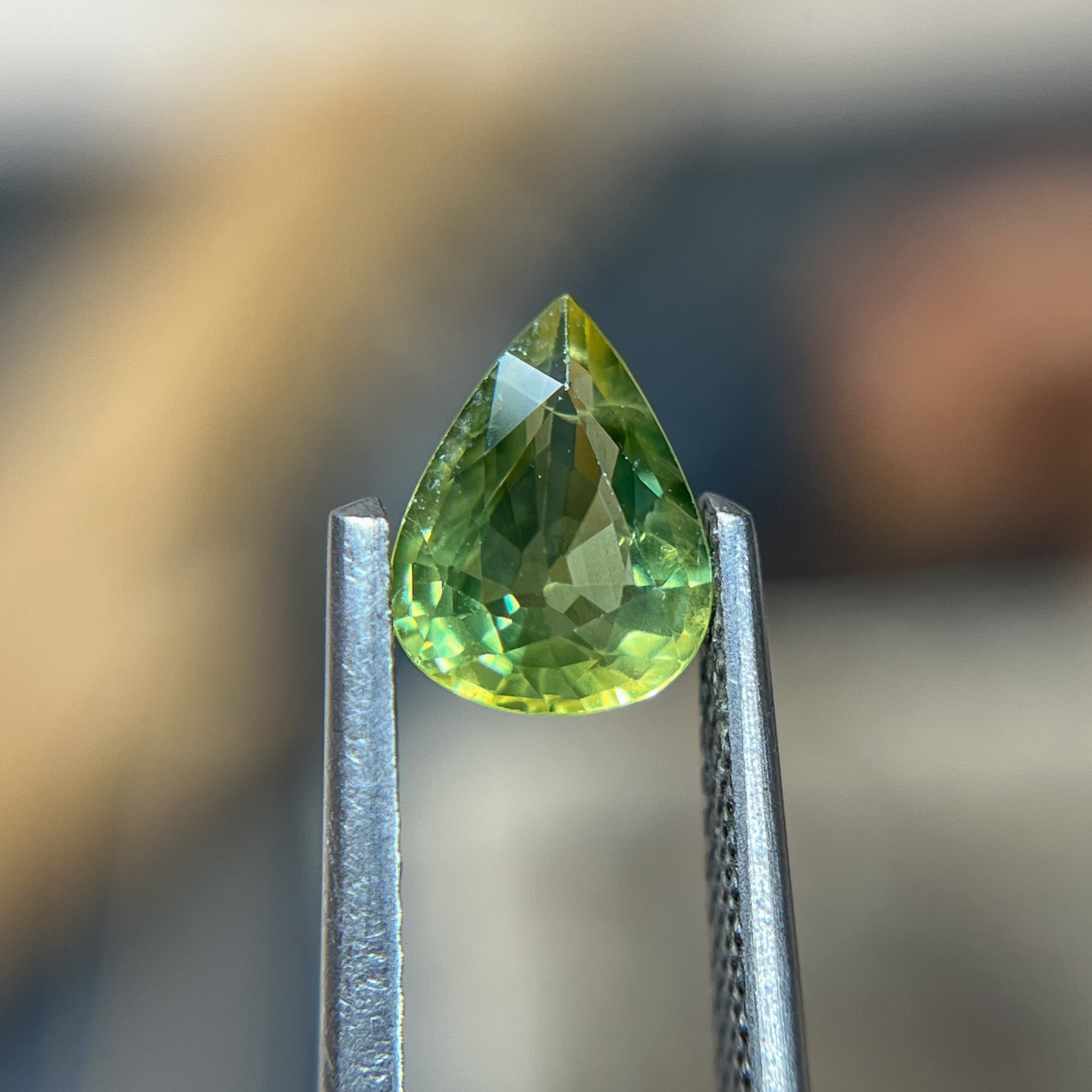 A pear-cut bright green Montana sapphire shimmers with untamed beauty, its verdant hue reminiscent of ancient forests and hidden glades. Sourced from the rugged landscapes of Montana, this rare gemstone holds a one-of-a-kind allure, each facet catching the light like sunlight through the trees. A breathtaking choice for those who seek a ring as wild and extraordinary as their love.