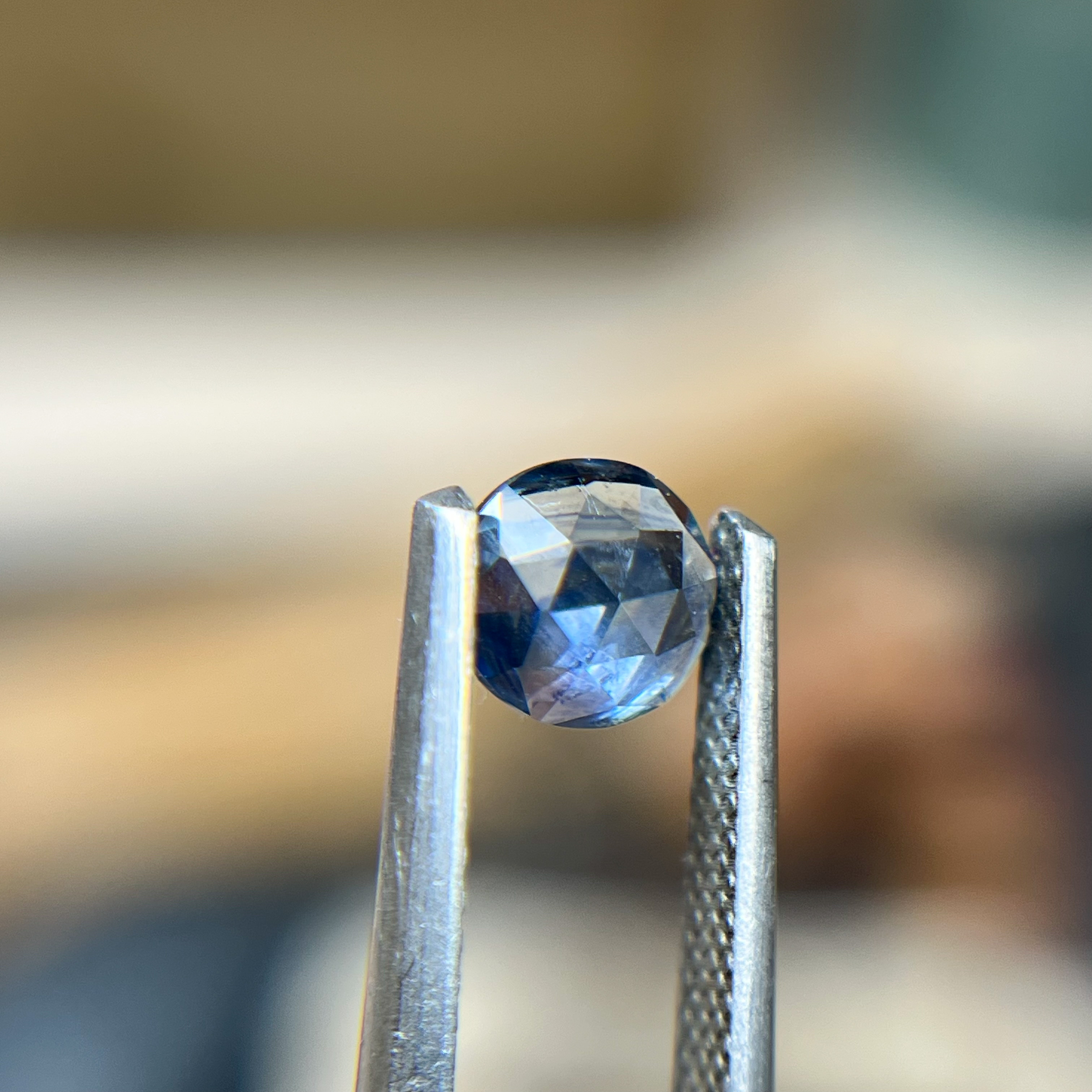A rose-cut blue Montana sapphire glows with an ethereal depth, its shifting hues reminiscent of twilight skies over untamed landscapes. The soft, domed facets catch the light like ripples on a hidden forest stream, making it an enchanting choice for those who seek a ring that feels both wild and timeless.