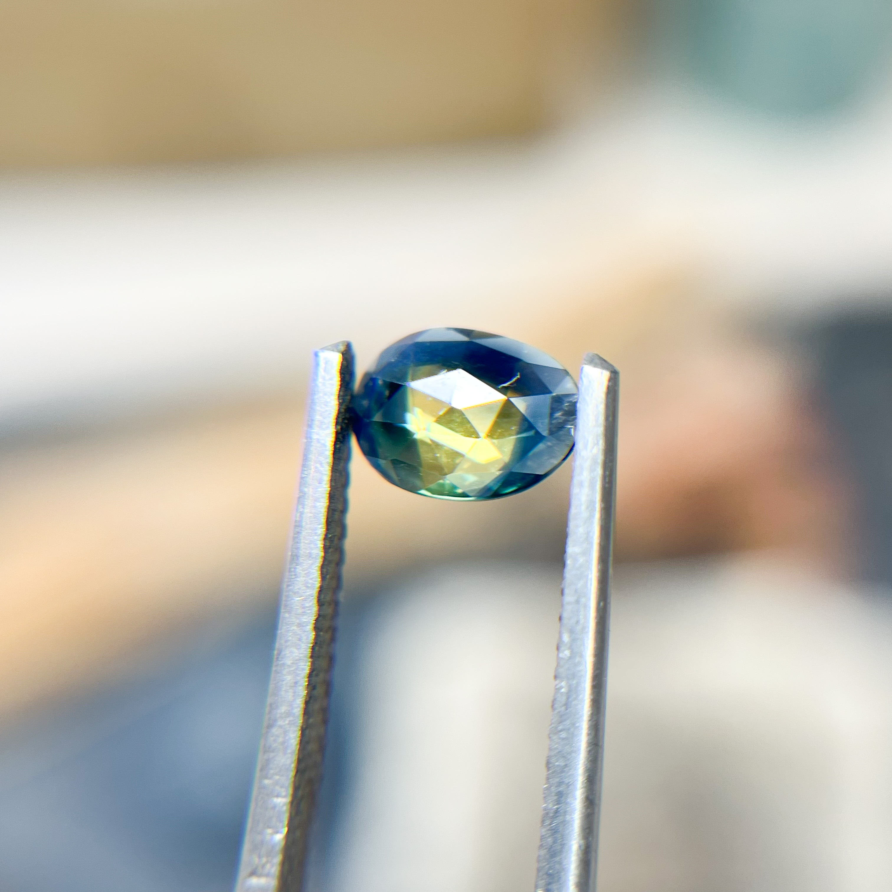 A rose-cut parti color sapphire from Australia, this gem is a true marvel of nature, shifting between deep teal and vibrant green with every movement. Celebrated for their rarity, Australian sapphires possess an untamed beauty, each one entirely unique in its blend of color. The mesmerizing hues of this sapphire make it a striking choice for those who seek a ring that feels both otherworldly and deeply connected to the natural world.