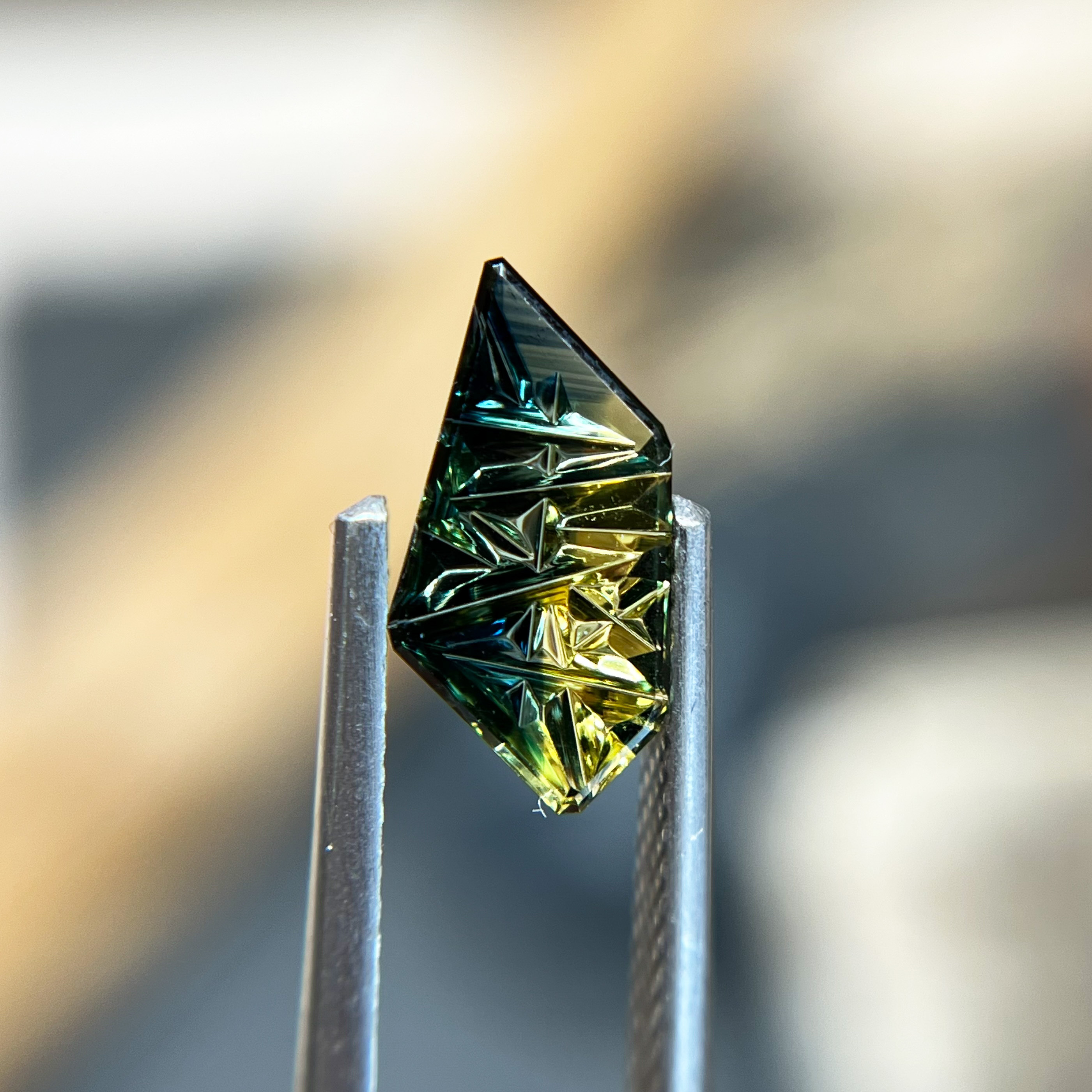 This Teal Lime Parti Color Freeform Australian Sapphire, expertly cut in the Dreamscape™ shape by renowned gem artist John Dyer, is a truly exceptional choice for an engagement ring. The stone’s vivid hues shift like a glimmering woodland stream, evoking a sense of enchantment and wonder. The Dreamscape™ cut, with its intricate facets and delicate asymmetry, ensures that no two stones are ever the same, making each one a work of art. John Dyer’s craftsmanship elevates this unique gem, creating a stone that feels both timeless and otherworldly—perfect for those seeking something extraordinary.
