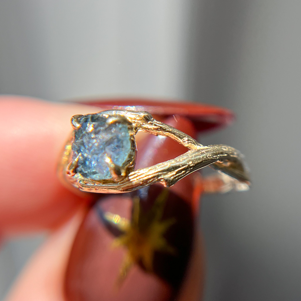 Molded from two real twigs that have been twisted around one another, the Unity Montana Sapphire Solitaire Engagement Ring highlights a stunning teal blue rough Montana Sapphire. This rough sapphire ring is a stunning testament to everlasting love, every uncut sapphire set within the band is as distinct as the partner with whom you’re sharing this great mystery called life.