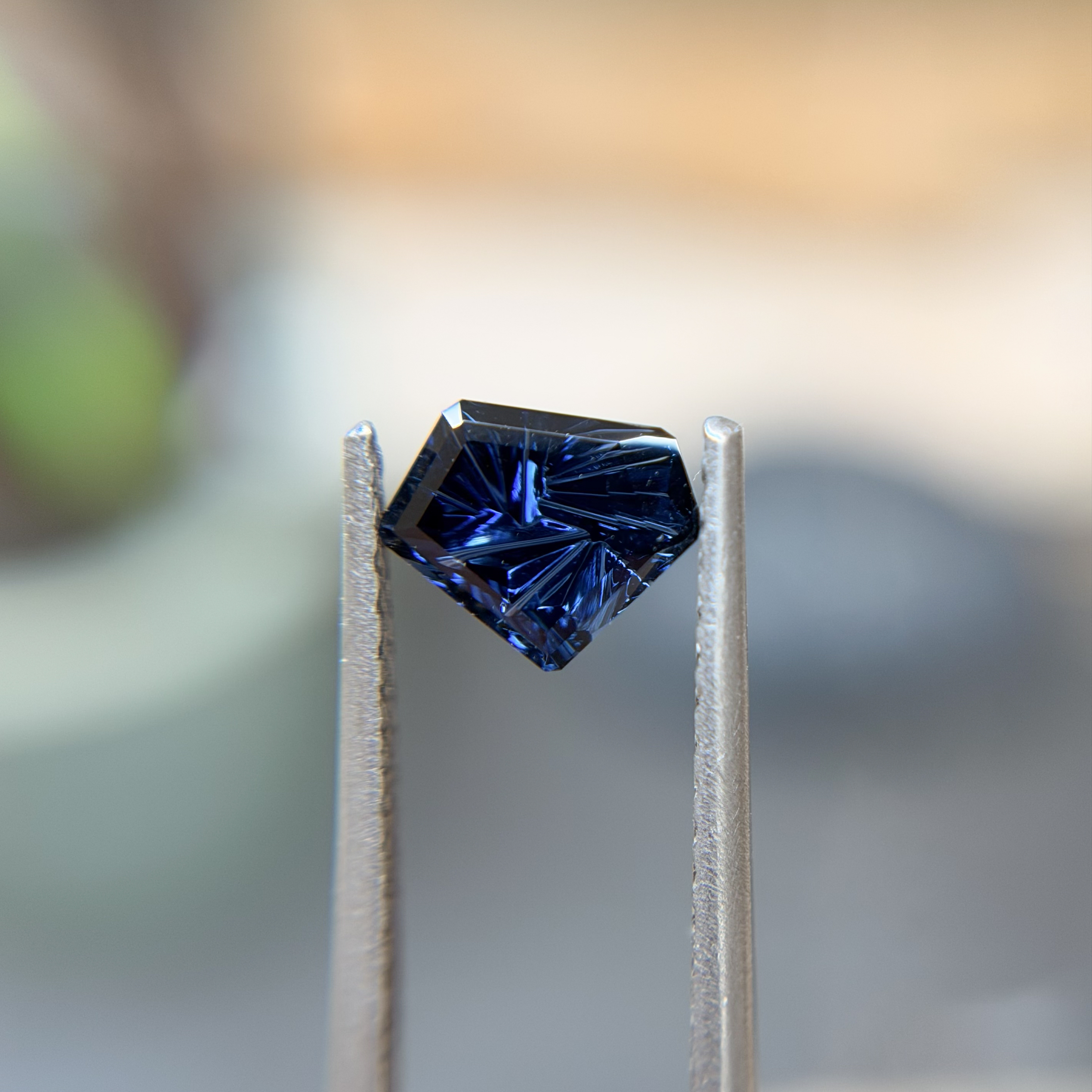 A rich, ocean-deep blue unfolds across this Australian sapphire, shaped into a freeform Dreamscape™ cut that feels sculpted by tide and time. Its facets catch flashes of lighter sapphire and ink-blue shadow, creating a sense of depth and quiet power. The irregular silhouette enhances its natural origins, making this stone ideal for a ring that honors both bold color and organic, hand-carved artistry.